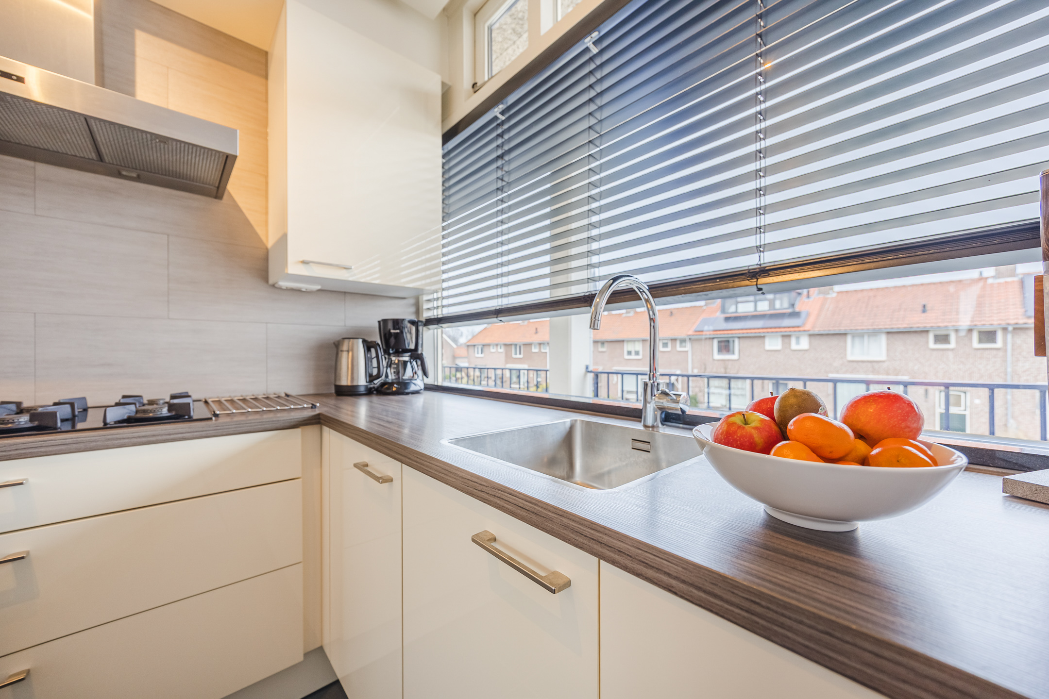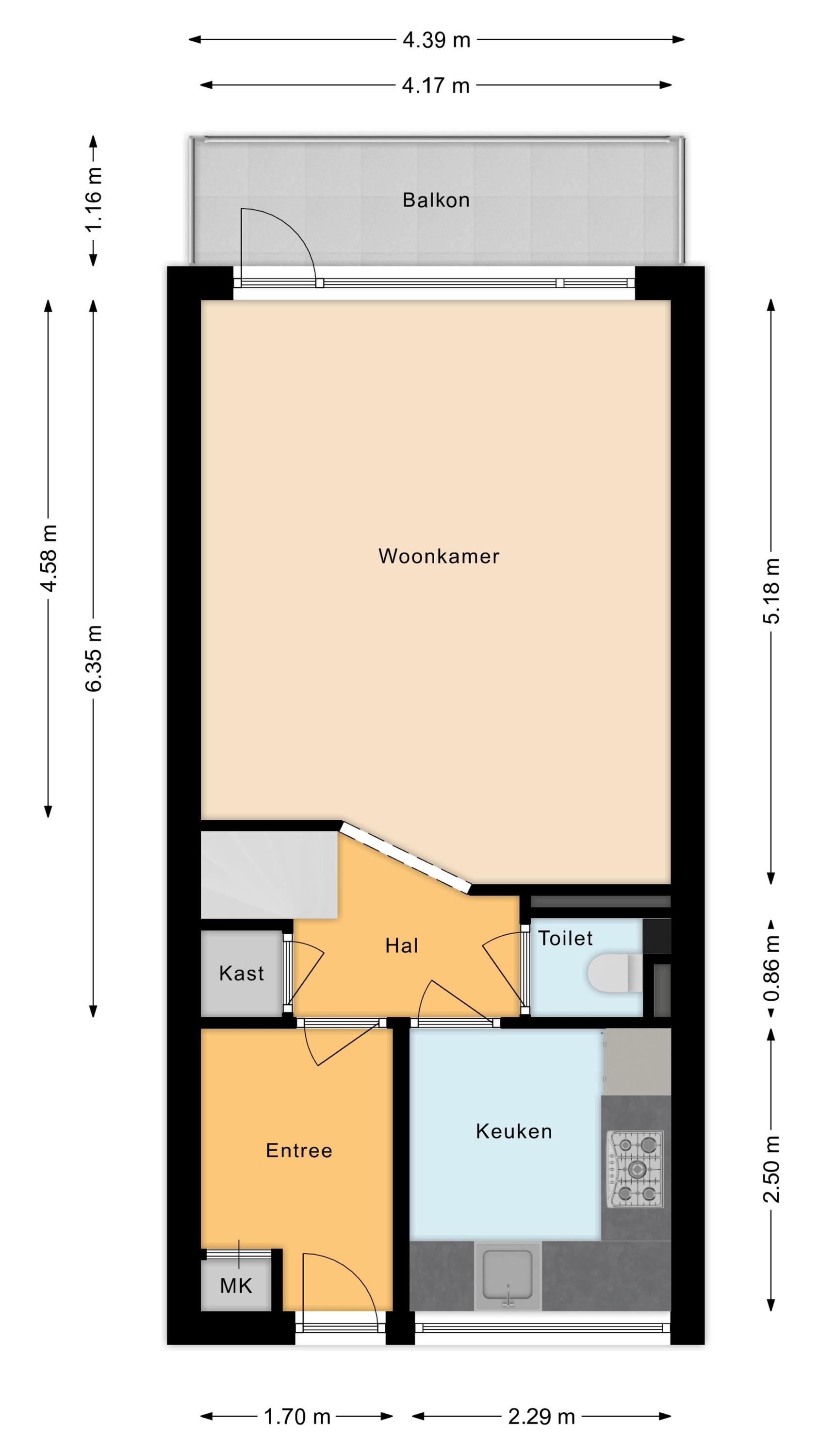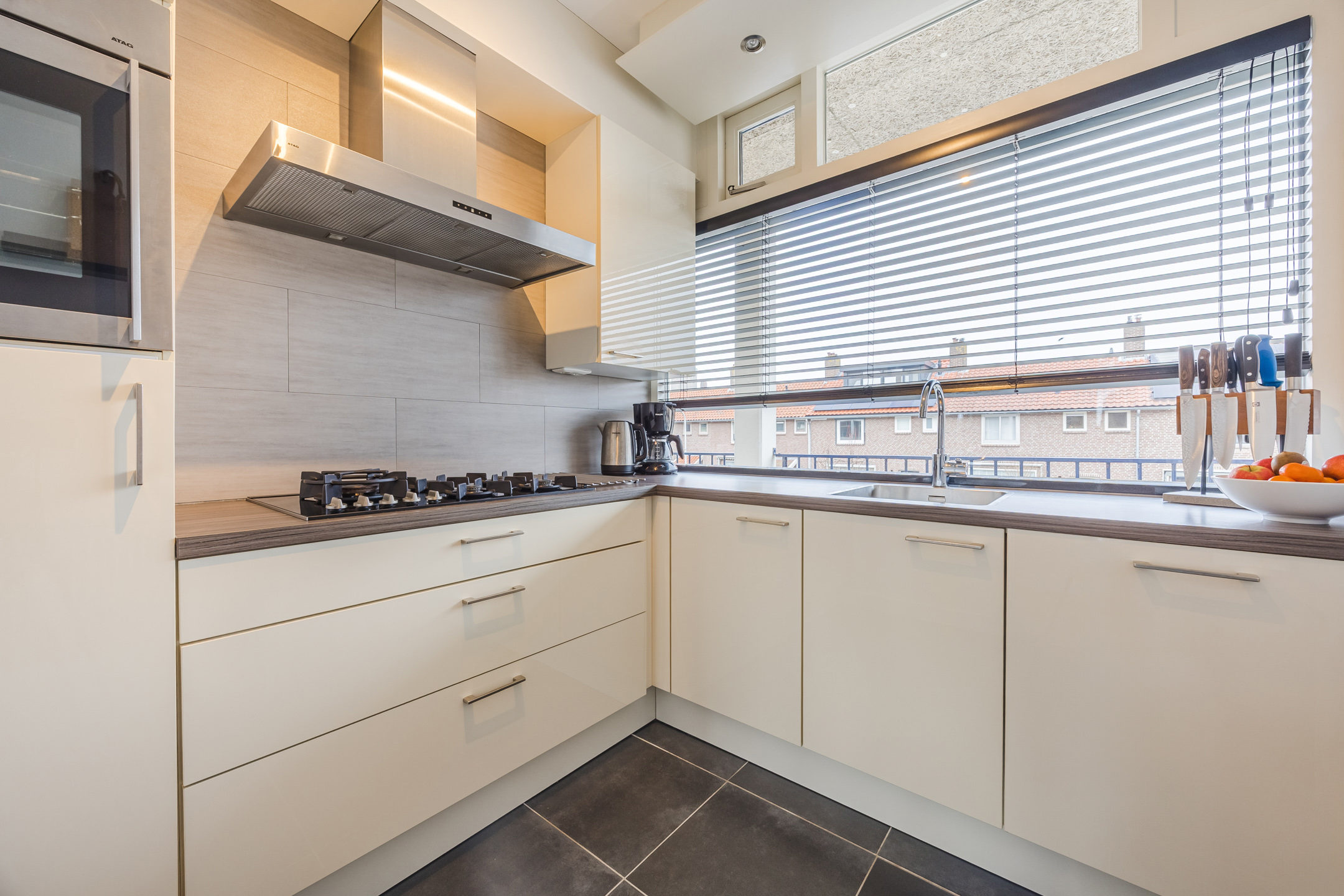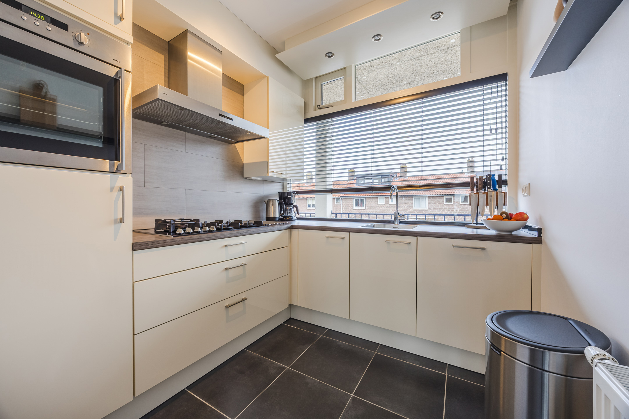 Via de entree bereikt u de ruime hal met bergkast en toilet. De lichte woonkamer is gelegen op het zuidwesten en biedt toegang tot het zonnige balkon met vrij uitzicht. De grote raampartijen zorgen voor een prettige lichtinval. Aan de voorzijde van de woning bevindt zich de nette keuken in L-opstelling, voorzien van diverse inbouwapparatuur.